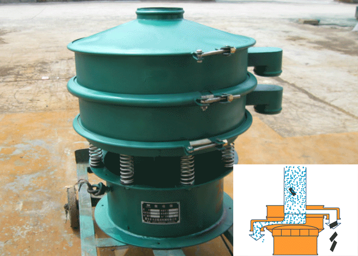 旋振篩,由直立式電機作激振源,旋振篩起動后,其動力裝置即振動電機上下兩端不同相位的偏心塊、由于高速放置作用而產生一復合慣性力,該慣性力強迫篩機振動體作復旋運動,篩框在振動力的作用下連續作往復運動,進地而帶動篩面作周期性振動,從而使篩面上的物料隨篩箱一同作定向踴躍式運動,其間,小于篩面孔徑的物料通過篩孔落到下層,成為篩下物,大于篩面孔徑的物料經連續跳躍運動后從排料口排出,完成篩分工作。