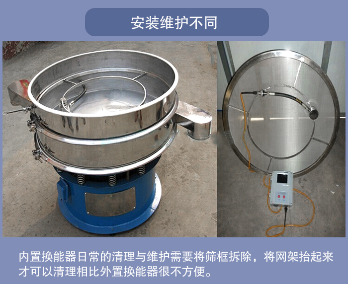 超聲波振動篩內置換能器:一般直接固定在超聲波振動篩網架中間,日常的清理與維護需要將篩框拆除,將網架抬起來才可以清理相比外置換能器很不方便。