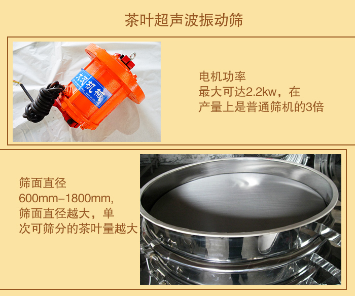 茶葉超聲波振動篩篩分時產1-5T/h,電機功率可達2.2kw,在產量上是普通篩機的3倍,篩面直徑600mm-1800mm,篩面直徑越大,單次可篩分的茶葉量越大,篩面的有效篩分面積決定單次篩分的量,進而間接性影響單次產量。